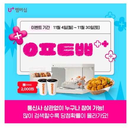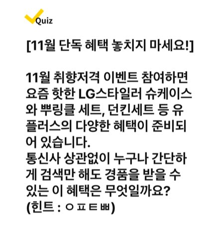 📝 [11월 단독 혜택 놓치지 마세요!] 11월 취향저격 이벤트 참여하면 요즘 핫한 LG스타일러 슈케이스와 뿌링클세트, 던킨세트 등 유플러스의 다양한 혜택이 준비되어 있습니다. 통신사 상관없이 누구나 간단하게 검색만 해도 경품을 받을 수 있는 이 혜택은 무엇일까요? (힌트 : ㅇㅍㅌㅃ)