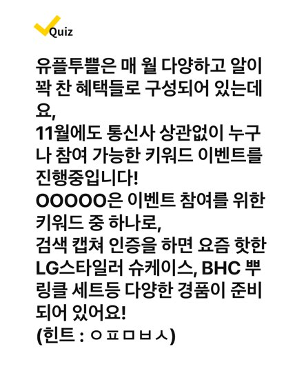 📝 유플투플은 매 월 다양하고 알이 꽉 찬 혜택들로 구성되어 있는데요, 11월에도 통신사 상관없이 누구나 참여 가능한 키워드 이벤트를 준비중입니다! OOOO은 이벤트 참여를 위한 키워드 중 하나로, 검색 캡쳐 인증을 하면 요즘 핫한 LG스타일러 슈케이스, BHC 뿌링클 세트 등 다양한 경품이 준비되어 있어요! (힌트 : ㅇㅍㅁㅂㅅ)