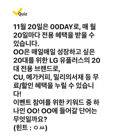 📝 11월 20일은 OODAY로, 매 월 20일마다 전용 혜택을 받을 수 있습니다. OO은 매일매일 성장하고 싶은 20대를 위한 LG유플러스의 20대 전용 브랜드로, CU, 메가커피, 밀리의서재 등 무료/할인 혜택을 누릴 수 있습니다! 이벤트 참여를 위한 키워드 중 하나인 OO! OO에 들어갈 단어는 무엇일까요? (힌트 : ㅇㅆ)