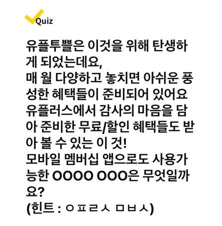 📝 유플투쁠은 이것을 위해 탄생하게 되었는데요, 매 월 다양하고 놓치면 아쉬운 풍성한 혜택들이 준비되어 있어요 유플러스에서 감사의 마음을 담아 준비한 무료/할인 혜택들도 받아볼 수 있는 이것! 모바일 멤버십 앱으로도 사용 가능한 OOOOOOO은 무엇일까요? (힌트 : ㅇㅍㄹㅅ ㅁㅂㅅ)