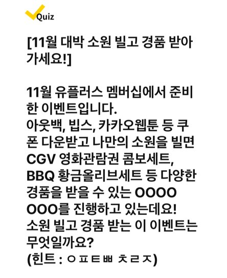 📝 [11월 대박 소원 빌고 경품 받아 가세요!] 11월 유플러스 멤버십에서 준비한 이벤트입니다. 아웃백, 빕스, 카카오웹툰 등 쿠폰 다운받고 나만의 소원을 빌면 CGV영화 관람권 콤보세트, BBQ 황금올리브세트 등 다양한 경품을 받을 수 있는 OOOOOOO를 진행하고 있는데요! 소원 빌고 경품 받는 이 이벤트는 무엇일까요? (힌트: ㅇㅍㅌㅃ ㅊㄹㅈ)